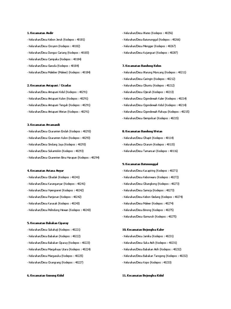 Daftar kode pos dan wilayah, desa/kelurahan, kecamatan/distrik, kota/kabupaten kodepos di indonesia terdiri dari lima angka: