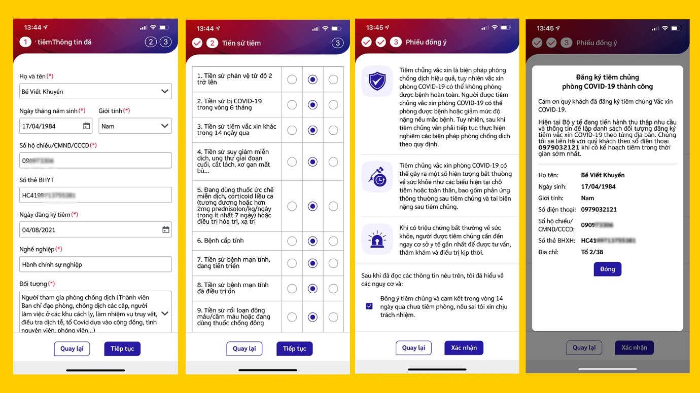Jun 22, 2021 · phần mềm đăng kí tiêm vaccine lần đầu tiên được chính thức triển khai tại công viên phần mềm quang trung (qtsc), nơi có gần 12.000 lao động "cổ cồn trắng" là chuyên viên, kĩ sư công nghệ của 190 doanh nghiệp (phần mềm và dịch vụ) đang hoạt động. Những người này khi đăng ký ở hệ thống tiêm chủng vnvc tức là họ đã chọn tiêm ngừa vắc xin dịch vụ. Jun 23, 2021 · quy trình tiêm chủng hiện nay gồm 4 bước: Đăng ký/kiểm tra, khám sàng lọc, tiêm, theo dõi sau tiêm. Trung tâm kiểm soát bệnh tật thành phố hồ chí minh. Người dân thuộc diện được tiêm chủng phải khai báo y tế, điền thông tin và ký tên vào phiếu đồng ý tiêm chủng, sau đó được nhân viên y tế khám sàng lọc và ký xác nhận. Vnvc ra đời nhằm cung cấp cho trẻ em việt nam những loại vắc xin có chất lượng tốt nhất cùng với hệ thống phòng tiêm chủng an toàn, hiện đại và cao cấp Việc tiêm chủng có thể gây ra các vấn đề về sức khỏe (bệnh hoặc khuyết tật). Hồ chí minh, việt nam Việc này dễ dàng và an toàn. Mặc dù điều này là cực kỳ hiếm, nhưng vẫn không loại trừ được tất cả rủi ro, chính vì lý do này mà một hệ thống trợ cấp đã được thành lập. Đăng ký, đặt hẹn và đi chủng ngừa. Hãy loan tin và giúp bạn bè và gia đình của bạn hoàn thành việc đăng ký của họ.